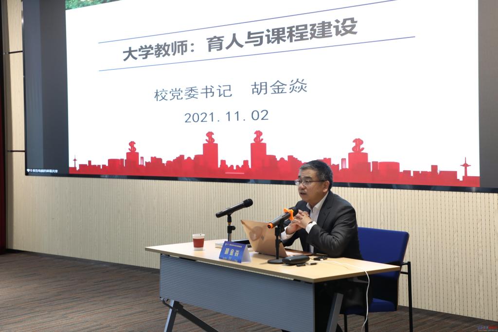 胡金焱以“大學(xué)教師:育人與課程建設(shè)”為題,就如何做一名合格的大學(xué)教師,從“人才隊(duì)伍建設(shè)是學(xué)校事業(yè)發(fā)展的根本所在”“高等教育面臨的新挑戰(zhàn)、新要求”“著力教育教學(xué)‘改革’與‘變革’”“守護(hù)大學(xué)教師的職責(zé)與情懷”和“課程育人的‘五個(gè)一工程’”五個(gè)方面進(jìn)行了闡述。