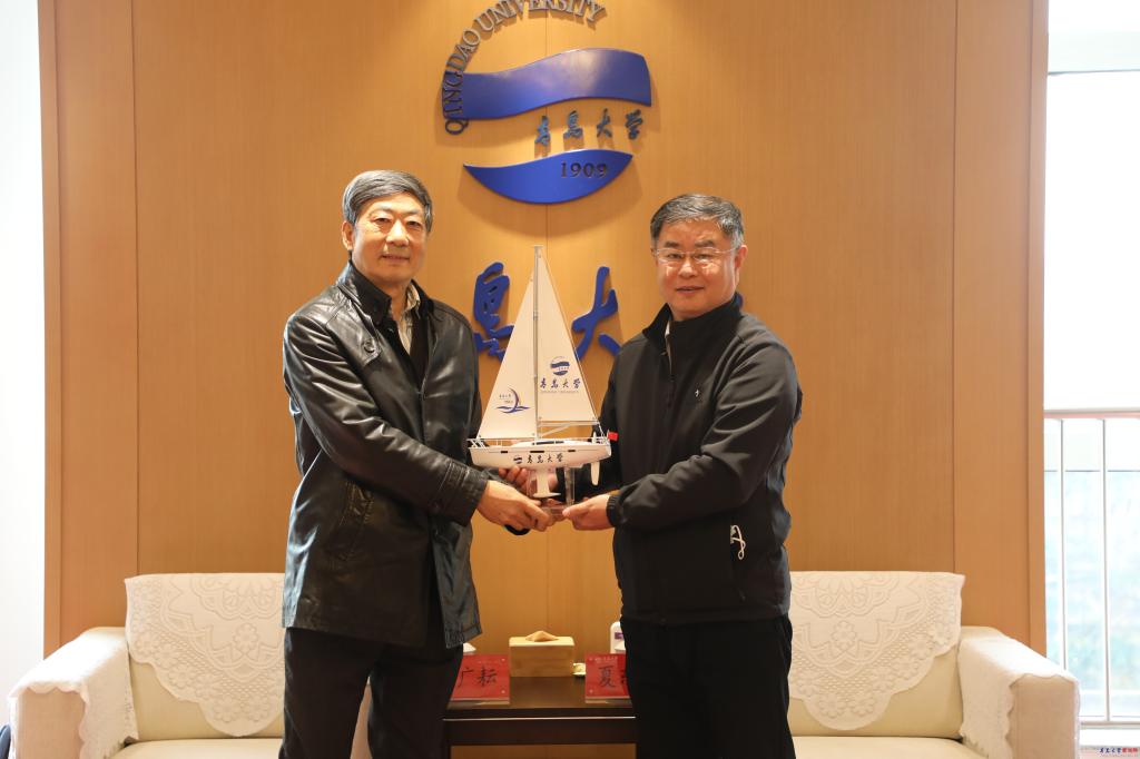 夏東偉向張廣耘贈送青島大學帆船模型,祝廣耘先生的事業一帆風順、身體健康。