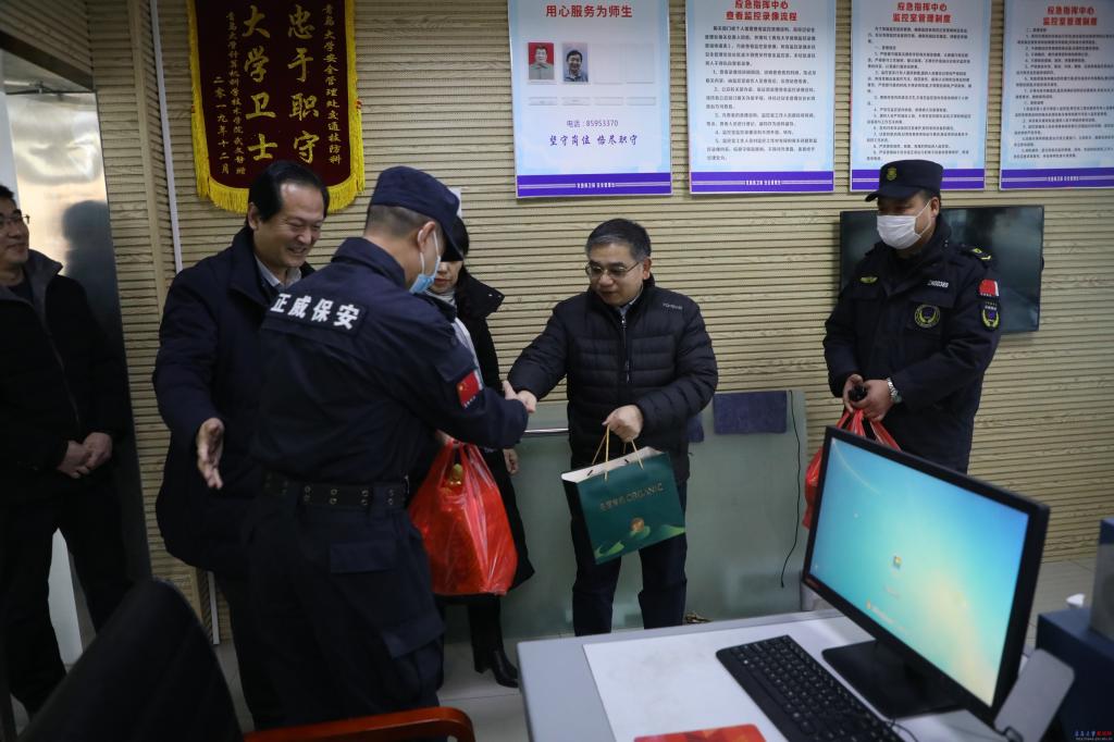 胡金焱一行先后走訪慰問了辦公樓門衛值班室、綜合應急指揮中心、西大門門衛崗亭、會議中心物業、換熱站等一線崗位,親切看望和慰問了一線教職員工,并致以節日問候和新春祝福,對他們的辛勤工作表示感謝。胡金焱詳細詢問了寒假安全穩定和疫情防控常態化工作有關情況,要求各項工作要力爭做到精準高效、服務溫馨、師生放心,要進一步升級校園智能化管理手段,不斷提高“平安校園”建設和管理水平。胡金焱勉勵寒假一線教職員工要繼續堅持優良作風、發揚奉獻精神,為師生歡度春節提供堅實保障。