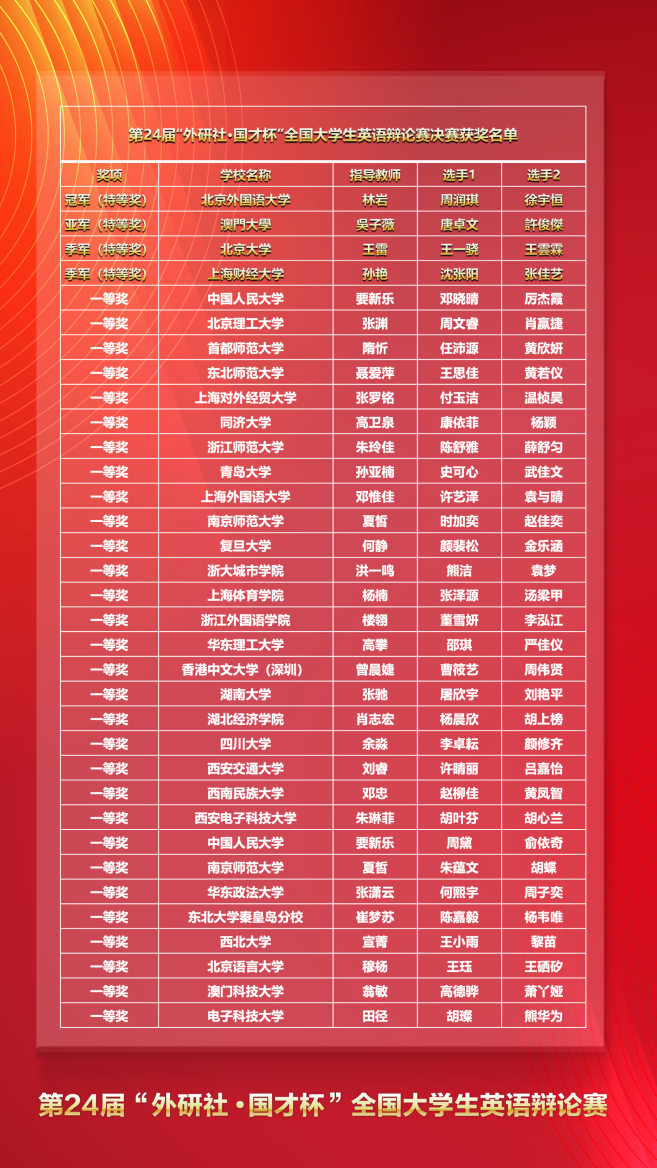 新聞網訊 6月13日,第24屆“外研社·國才杯”全國大學生英語辯論賽落下帷幕。我校醫學部研究生史可心、數學與統計學院本科生武佳文組成代表隊在公共外語教育學院孫亞楠老師指導下獲全國一等獎。這也是截止目前,我校參加“外研社·國才杯”全國大學生英語辯論賽的最佳戰績。