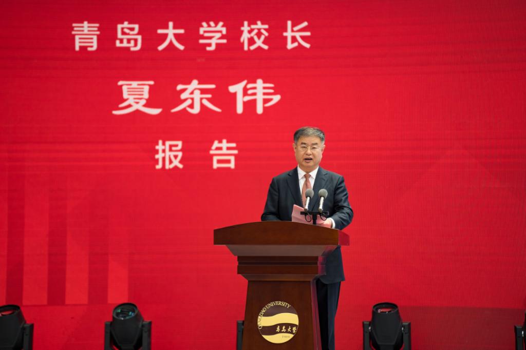 夏東偉作題為《大道同行三十載逐夢奮進新征程》的學校創新發展報告。他說,作為國家改革開放以來首批合并辦學的高校,三十年來,青大人始終心懷“國之大者”,教授高深學問,養成碩學宏才,應國家之需要,繪就了一幅開拓進取、奮勇爭先的恢弘畫卷,在中國高等教育改革創新發展史上,寫下了濃重的一筆。面向未來,青島大學已開啟全面建設高水平綜合性研究型大學的新征程。要始終堅守為黨育人、為國育才的初心和使命,落實立德樹人根本任務,努力培養堪當民族復興大任的時代新人;要牢固樹立“人才是第一資源”的理念,堅持人才強校戰略,造就一支師德高尚、業務精湛、結構合理、充滿活力的教師隊伍;要加快實施學科集群和學科交叉融合發展戰略,堅持高質量發展,早日實現國家一流學科的突破;要堅持“四個面向”,深化校地融合,擦亮醫療、紡織、教育、文化創意等服務地方的“金字招牌”,把論文寫在祖國大地上、寫在齊魯沃土中,寫在青島山海間;要堅守大學精神,建設大學文化,努力成為推動社會發展的重要力量、守護人類命運共同體的堅強陣地。站在新的起點,青大人將不忘初心,牢記使命,逐夢奮進新征程,秉持“明德、博學、守正、出奇”的校訓精神,為建成在國內外有較大影響的一流大學而不懈奮斗。為全面建設社會主義現代化強國、全面推進中華民族偉大復興做出青大貢獻。