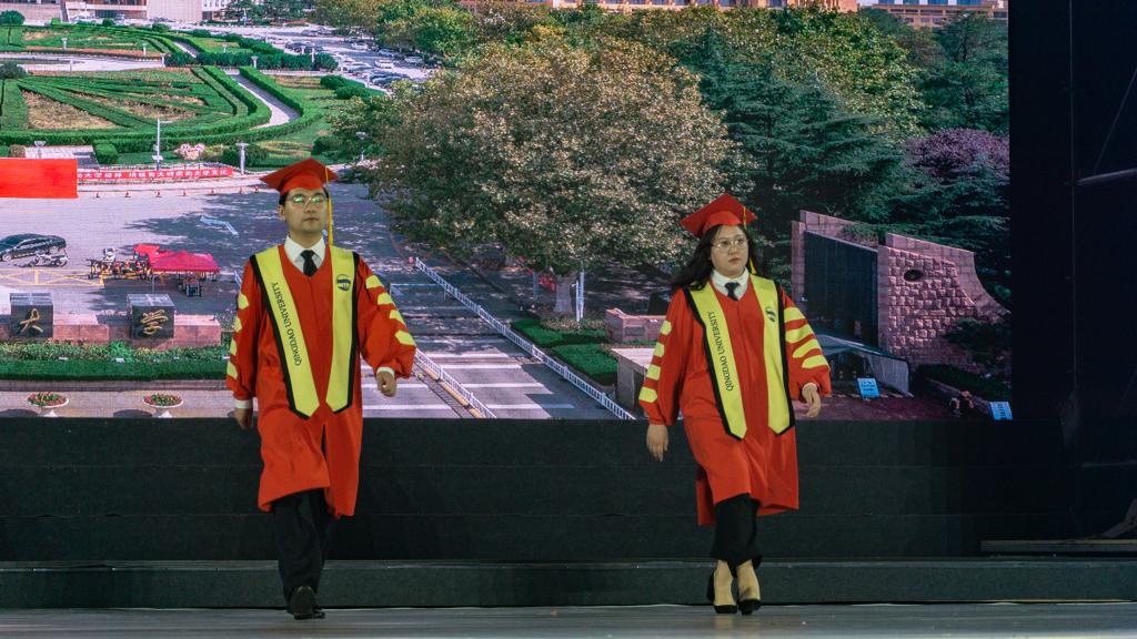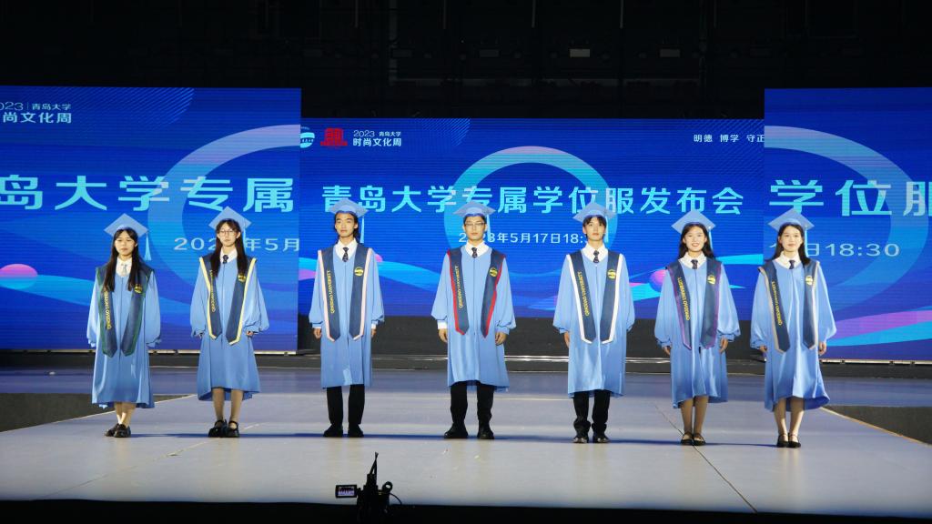 據悉,學位袍主色選擇了青島大學的標志色“青大藍色”及“青大紅”。學生學位袍的設計取自于海洋色彩,隨著學位層次的提高藍色由淺及深,寓意學術研究精進深入。導師及校長服的袍身主色采用“青大紅”,寓意師德如半天朱霞,凸顯威嚴與莊重。右側繡有青島大學的標準英文字體,左側繡有校徽。學位帽裝飾以青島大學的英文簡稱QU的金色金屬掛飾,可拆卸作為畢業生的留念。此外,還設計了青島大學學位服周邊產品,例如領帶、襪子等。