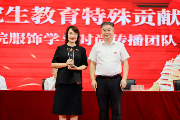 典禮上,夏東偉為紡織服裝學院服飾學與時尚傳播團隊頒發青島大學學位與研究生教育特殊貢獻獎,團隊負責人初曉玲教授上臺領獎。