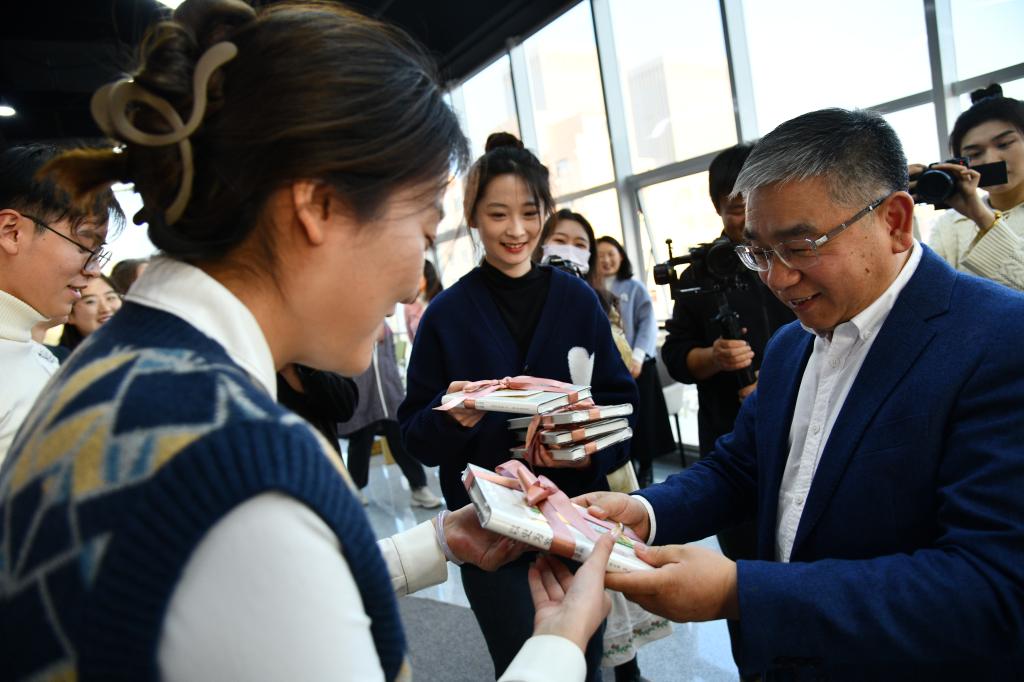 與會學(xué)生結(jié)合自己的專業(yè)暢談自己對文化“兩創(chuàng)”理解和認(rèn)識,胡金焱給學(xué)生贈書《以史為鑒》,并題詞勉勵。