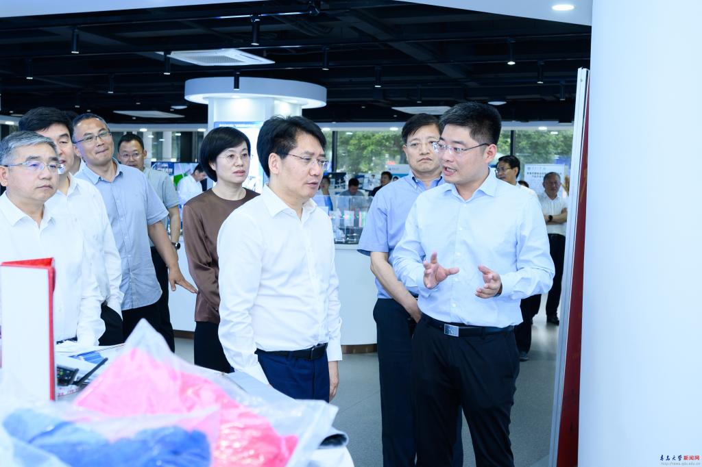在產業技術研究院和生態紡織省部共建協同創新中心,鄧云鋒認真聽取了學校科技創新和成果轉化有關情況匯報,觀看了部分實物展品、現場演示,與學校相關科研人員進行了交流,對學校在海洋纖維新材料、鹽堿地治理、固態電池、人造血管、人工智能等領域取得的突破性進展予以充分肯定。鄧云鋒強調,青島大學要深化校地校企合作,進一步梳理紡織工程、生命健康、新能源新材料、新一代信息技術等優勢學科服務產業發展的融合鏈條,提升學校創新資源服務社會經濟發展的驅動力,在服務支撐山東經濟社會高質量發展中貢獻青大力量。