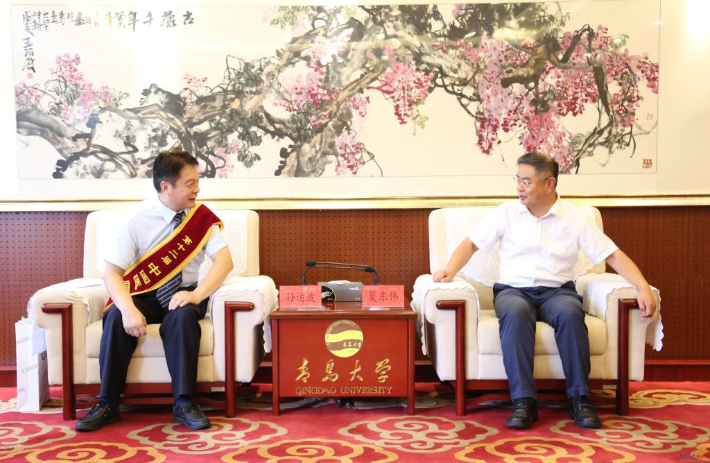 新聞網訊 8月20日,校長夏東偉在辦公樓204接待室會見我校第12屆“中國醫師獎”獲得者、醫療集團副院長、附屬醫院重癥醫學中心主任孫運波教授。