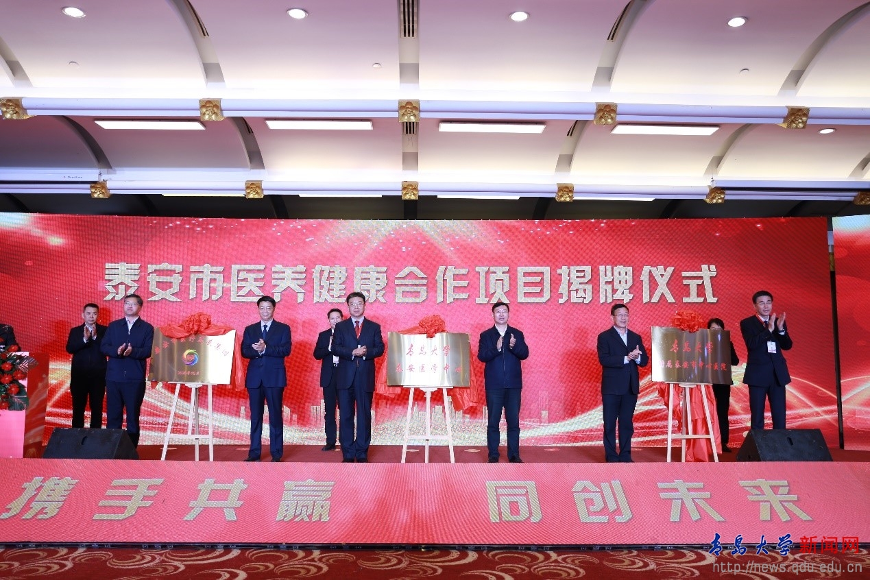 新聞網訊 11月21日上午,我校與泰安市人民政府在泰安市醫養健康合作項目集中簽約暨醫療發展集團揭牌儀式上,簽署共建“青島大學泰安醫學中心”戰略合作協議,并將泰安市中心醫院納入直屬附屬醫院管理體系,青島大學附屬泰安市中心醫院正式揭牌。