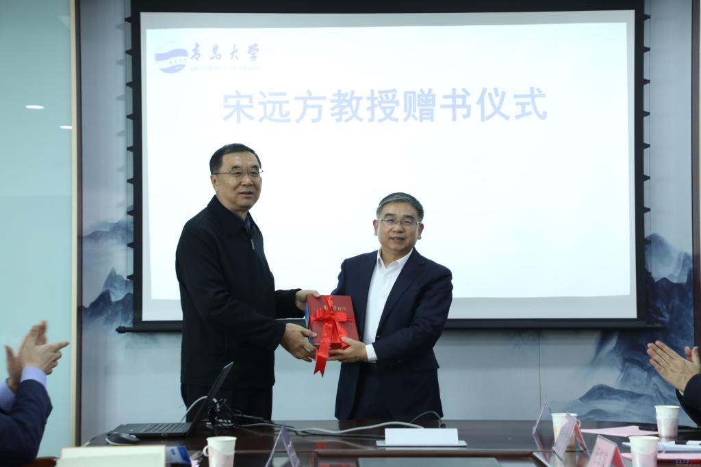 宋遠方將近年來著作贈予學校并與與會同志交流。他指出,青島大學是一所百年老校,不僅有悠久的歷史,如今也煥發了新的青春活力,薪火相傳,砥礪奮進,為國家和社會培養了大量人才,為國家和區域經濟社會發展作出了重要貢獻。黨的十九屆五中全會提出,堅持創新在我國現代化建設全局中的核心地位,把科技自立自強作為國家發展的戰略支撐。作為青島大學的一份子,在落實立德樹人根本任務,為學校發展、人才培養貢獻力量。