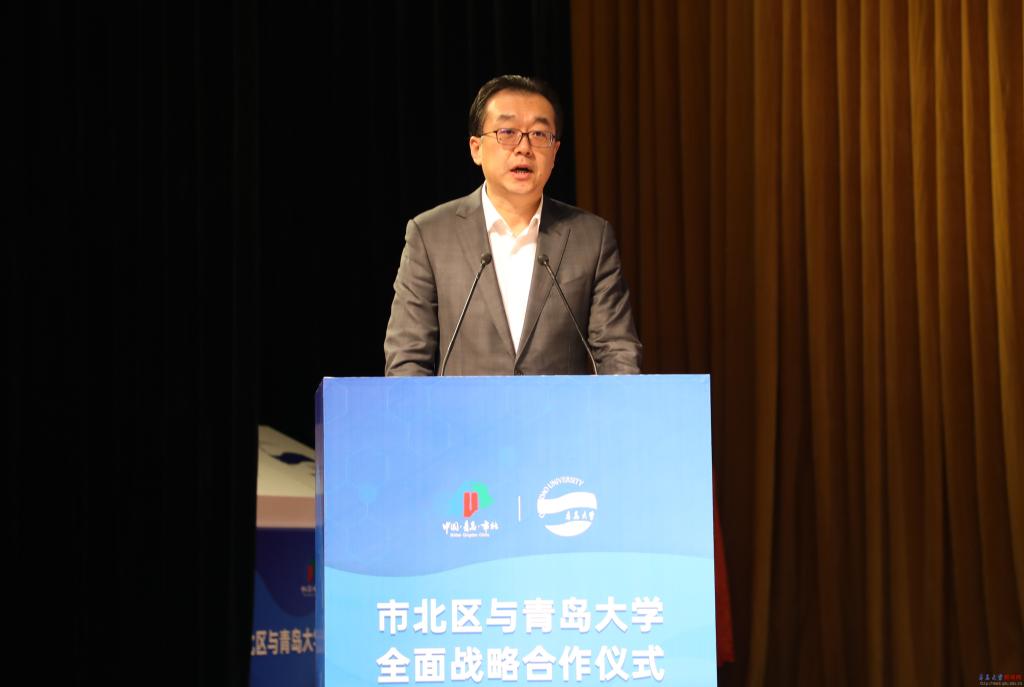 張新竹在致辭中指出,“越是重任在肩,我們?cè)叫枰^續(xù)拓展多方合作,越需要匯集優(yōu)質(zhì)創(chuàng)新要素,越需要專(zhuān)家學(xué)者的智慧和才能。市北擁有健全的產(chǎn)業(yè)政策、良好的產(chǎn)業(yè)生態(tài)、一流的營(yíng)商環(huán)境和豐富的產(chǎn)業(yè)流量,特別是探索出一套政校企合作、產(chǎn)學(xué)研融合新模式,愿意為促進(jìn)青島大學(xué)創(chuàng)新成果轉(zhuǎn)化提供新場(chǎng)景支撐,愿意和青島大學(xué)同頻共振,一道為青島發(fā)揮在‘雙循環(huán)’新發(fā)展格局中的“雙節(jié)點(diǎn)”價(jià)值作出積極貢獻(xiàn)。所以,市北區(qū)與青島大學(xué)建立全面戰(zhàn)略合作關(guān)系,是在‘天時(shí)地利’下的‘人和’。