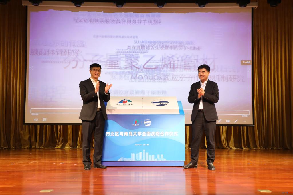 儀式現(xiàn)場(chǎng)發(fā)布了青島大學(xué)與市北區(qū)合作項(xiàng)目清單,根據(jù)具體合作方向,合作項(xiàng)目分為醫(yī)療健康、科技創(chuàng)新、基礎(chǔ)教育、文化旅游以及“三新”產(chǎn)業(yè)五大板塊,共353個(gè)擬合作項(xiàng)目。隨后,青島大學(xué)與市北區(qū)簽署全面戰(zhàn)略合作協(xié)議,同時(shí)進(jìn)行了合作共建青島大學(xué)市北附屬中學(xué)、智能關(guān)節(jié)鏡、海藻纖維紡織新材料等項(xiàng)目的現(xiàn)場(chǎng)簽約。此外,現(xiàn)場(chǎng)還進(jìn)行了青島青北科創(chuàng)投資集團(tuán)有限公司、青島大學(xué)基礎(chǔ)教育研究院、青島大學(xué)新金融研究院、青島大學(xué)青島醫(yī)學(xué)院科研成果轉(zhuǎn)化基地、“青島里院”寫(xiě)生基地等5個(gè)項(xiàng)目的揭牌儀式。