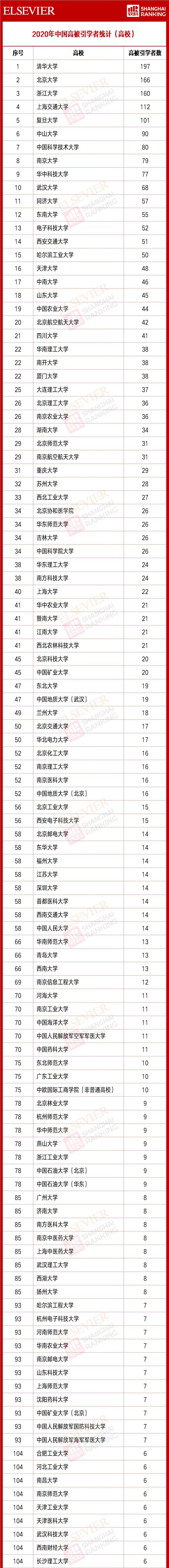 2020年中國高被引學者來自373所高校、企業和科研機構,中國科學院擁有最多的高被引學者,共441位。高校中,共296所大學有學者入選。其中,我校共有13位學者入選,位列全國高校第66位,山東省高校第2位。