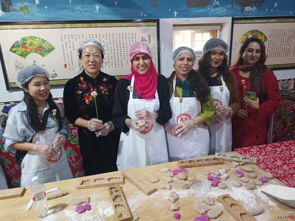 留學(xué)生們首先來到了“山東省美麗宜居村莊”“山東省鄉(xiāng)村文明家園建設(shè)示范村”“山東省生態(tài)文明村”“青島市社會(huì)主義新農(nóng)村建設(shè)示范村”—萊西市水集街道產(chǎn)芝村,在萊西市馬氏巧餅第七代傳承人馬秀娥的指導(dǎo)下,在七巧工坊學(xué)習(xí)了非遺七巧餅的制作方法。