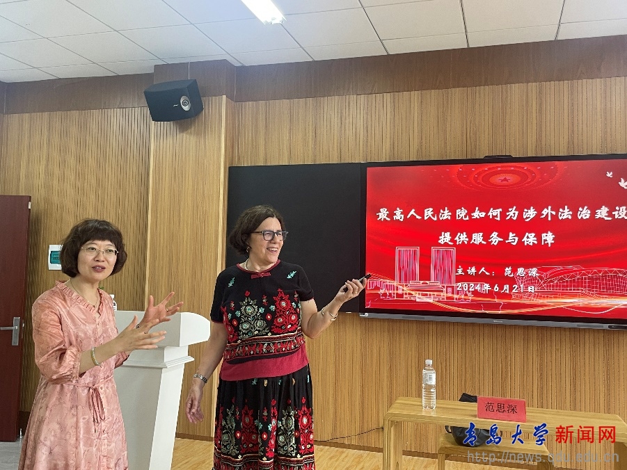 新聞網訊 6月21日,北京大學國際法學院常駐知名學者范思深教授(Susan Finder)應我校邀請參加法學院組織的“法學家茶座活動”,為學校師生作了題為“最高人民法院如何為涉外法治建設提供服務與保障”的專題講座。法學院副院長王靜主持講座,院長助理許慶永副教授、青年博士陳喆老師以及法學院、浮山書院的同學參加了此次講座。