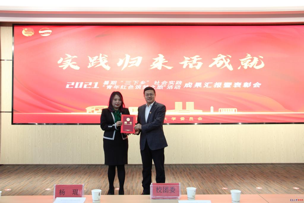 新聞網(wǎng)訊 為深入學習宣傳貫徹習近平新時代中國特色社會主義思想,結(jié)合“學黨史、強信念、跟黨走”學習教育部署,引導我校青年學生牢記總書記囑托,在中國共產(chǎn)黨成立100周年之際,在社會實踐中受教育、長才干、做貢獻,成長為擔當民族復興大任的時代新人。11月10日下午2點,學校在浮山校區(qū)會議中心舉行2021年青島大學大學生志愿者暑期文化科技衛(wèi)生“三下鄉(xiāng)”社會實踐“青年紅色筑夢之旅”活動成果匯報暨表彰會。校黨委副書記杜方波出席會議,校團委副書記李鵬主持。