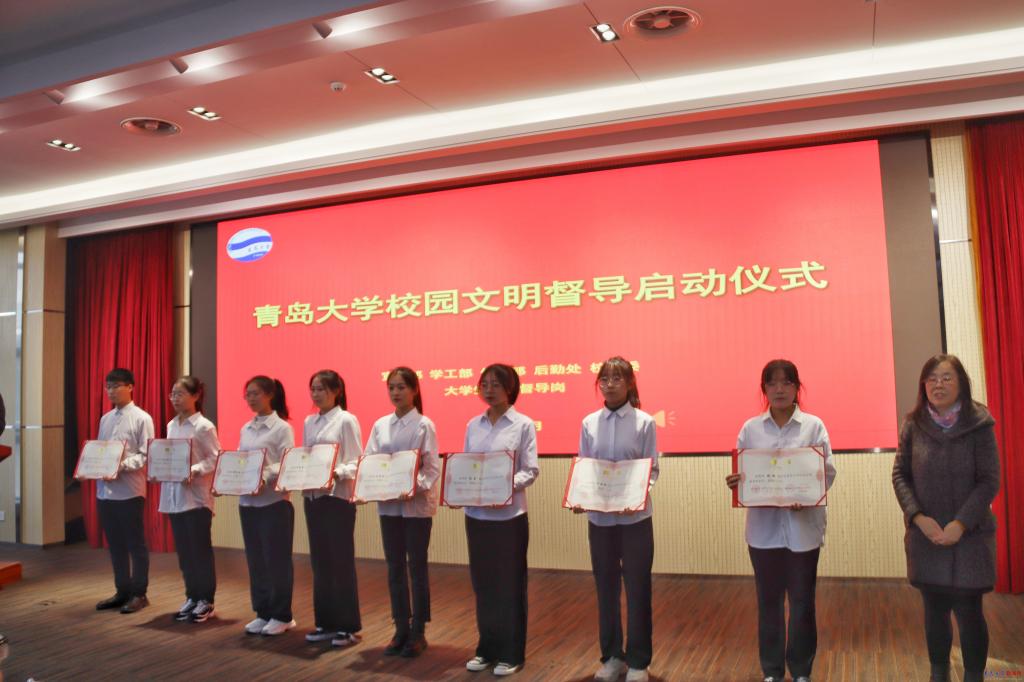 儀式中,校黨委宣傳部副部長魏喆吉介紹青島大學(xué)校園文明督導(dǎo)隊籌備情況。校園文明督導(dǎo)隊隊員集體宣誓后,后勤管理處黨委書記王靜為隊員頒發(fā)聘書。