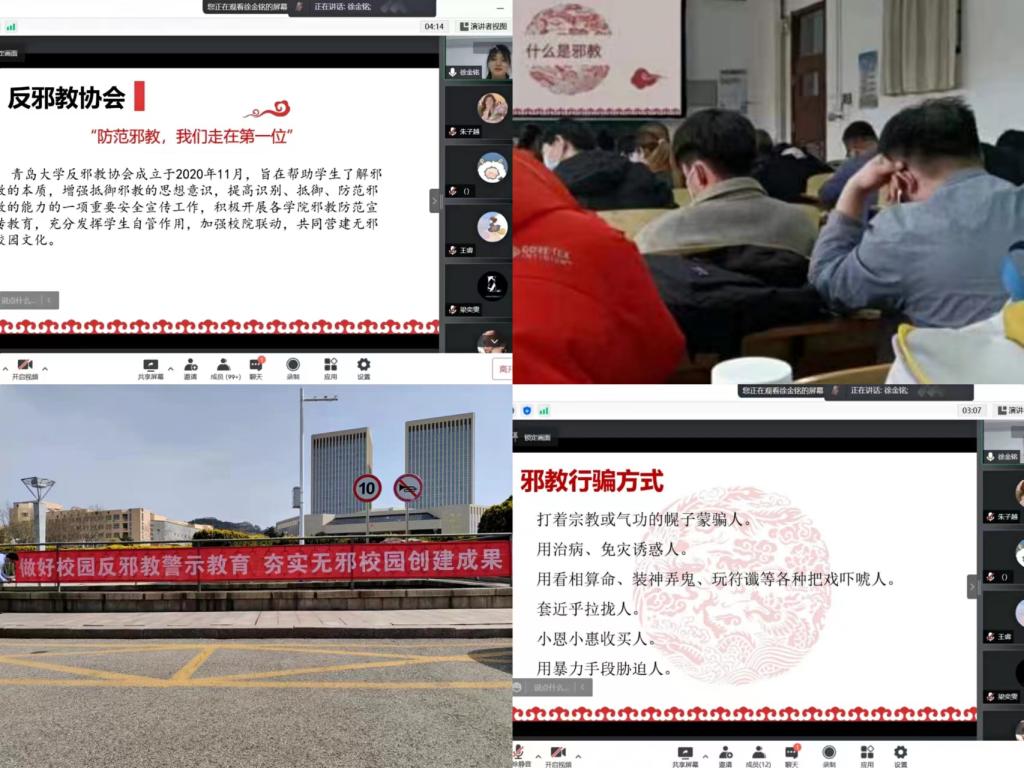 宣傳教育活動(dòng)期間,安全管理處組織在各校區(qū)懸掛反邪教警示標(biāo)語(yǔ)共10余條,發(fā)放《崇尚科學(xué),關(guān)愛(ài)家庭,珍惜生命,反對(duì)邪教》的宣傳單、宣傳掛圖3000余份、《青島大學(xué)校園反邪教倡議書(shū)》2000余份、各類反邪教宣傳單品500余份。校學(xué)生安防宣講團(tuán)積極組織開(kāi)展反邪教專題學(xué)習(xí)活動(dòng),分別面向師范學(xué)院、紡織服裝與工程學(xué)院的同學(xué)們,開(kāi)展了以“崇尚科學(xué),反對(duì)邪教”為主題的線上宣講活動(dòng),組織學(xué)生集中觀看反邪教警示教育片,切實(shí)做到“走進(jìn)學(xué)生、貼近學(xué)生”。