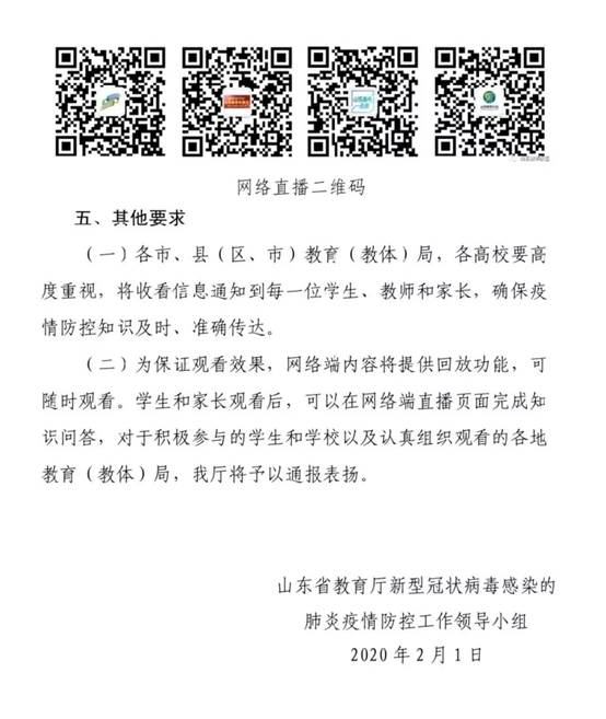 附:《山東省教育廳新型冠狀病毒感染的肺炎疫情防控工作小組關(guān)于組織收看疫情防控特別節(jié)目的通知》(魯教疫控組字[2020]5號(hào))文件