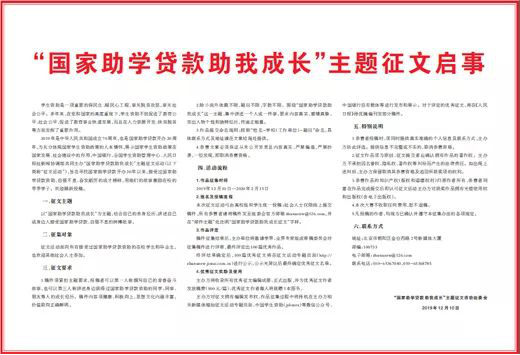 2019年是中華人民共和國成立70周年,也是國家助學貸款開辦20周年,為充分體現國家學生資助政策的人本情懷,展示國家學生資助政策在國家發展、社會建設中的作用,中國銀行、全國學生資助管理中心、人民日報社新聞協調部共同主辦“國家助學貸款助我成長”主題征文活動(以下簡稱“征文活動”),旨在尋找國家助學貸款開辦20年以來,接受過國家助學貸款資助、自強不息、奮發蹈厲的成才榜樣,用他們的故事激勵在校的莘莘學子。歡迎踴躍投稿。